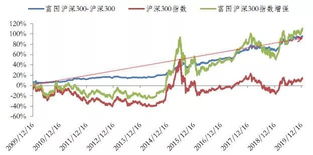 计算说明:“富国沪深300-沪深300”的计算方式为富国沪深300指数增强基金每日相对基期的收益率减去沪深300指数每日相对基期的涨跌幅,基期为2009年12月16日,收益率根据每日份额净值计算。每日份额净值数据来自于富国基金官网(已经托管行复核),沪深300指数数据来自于wind,时间区间:2009-12-16至2019-12-31。