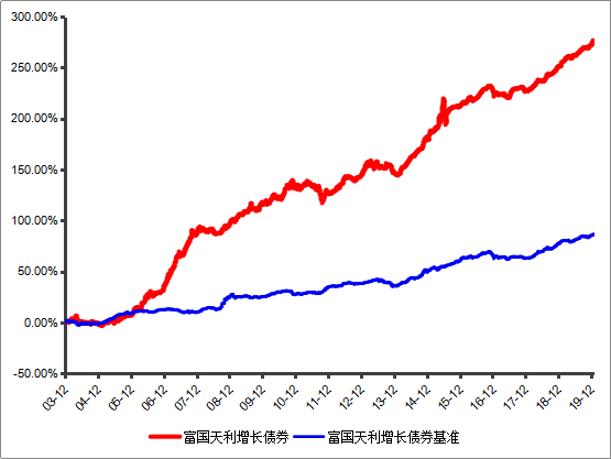 富国天利增长债券成立于2003-12-02,业绩比较基准为中国债券总指数。成立以来所有完整年度(2004-2018)的收益率(及基准收益率)分别为-2.63%(-2.42%),11.57%(10.26%),27.56%(2.89%),38.70%(-1.80%),3.65%(14.89%),8.94%(-1.24%),7.99%(1.92%),-3.45%(5.72%),9.74%(2.51%),-1.54%(-2.10%),15.80%(11.23%),11.18%(8.03%),2.91%(1.30%),0.88%(-1.19%),7.45%(9.63%),2019年上半年为3.27%(1.49%)。数据源自定期报告。