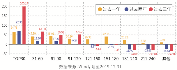 其次,不同市值的企业表现差异也明显,市值Top30的龙头股涨跌幅远好于剩下的个股,并远超医药行业指数。