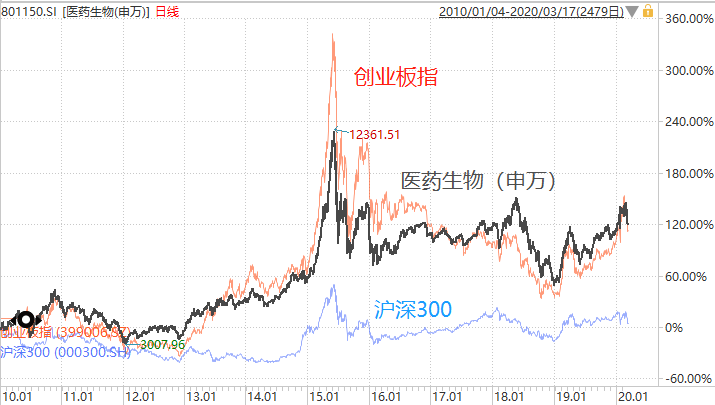 从大约近10年的维度看,无可厚非,医药是典型的成长性行业,潜力无穷,收益率和创业板指相差不大,并能远远超过沪深300。