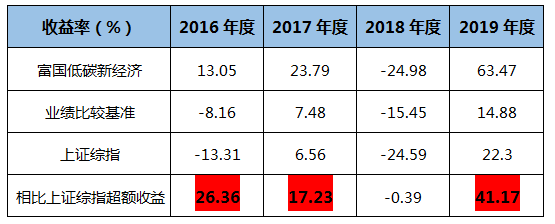 富二还截取了该基金成立以来的4个完整年度的业绩。相对于大盘,都有更“带劲”的表现。特别是在2016年度、2017年度、2019年度,富国低碳新经济相对上证综指都有较高的超额收益。