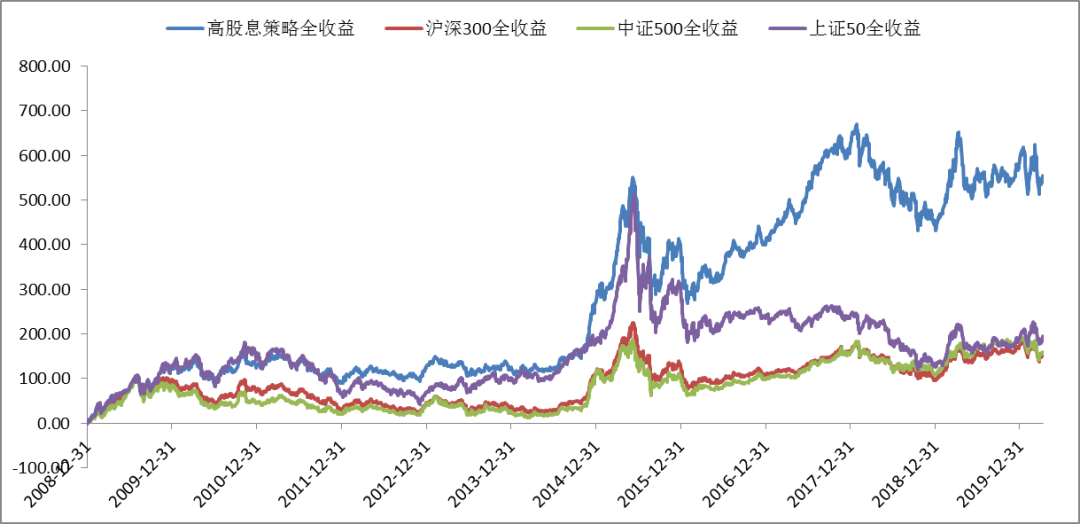 那么红利策略作为“舶来品”,在A股的水土环境中还是否依然有效呢?我们选取了高股息策略指数和其他主流指数做一个对比,这里为了体现“分红”的功劳,选择的都是全收益指数——