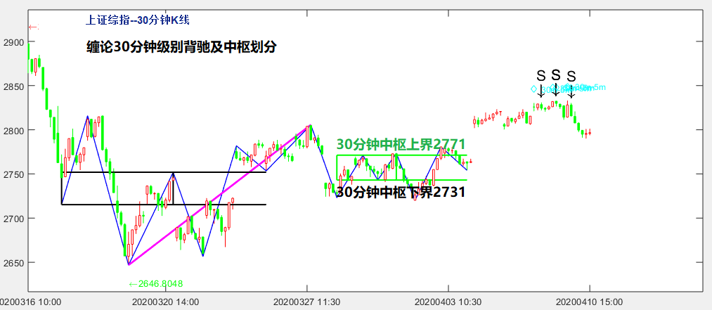 然后,我们再从30分钟级别的视角来看最近一段时间的反弹,下图明确显示当下出现了一个30分钟级别的盘整顶背驰,或有一定的调整需求。乐观情形下,对应的前一个30分钟笔中枢区域2731-2771是一个值得观察的区域,只是具体会是哪种情形还得当下再做判断。(数据来源:券商研报,投资需谨慎)