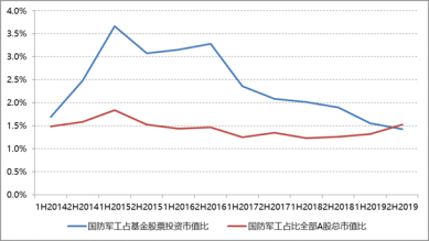 目前基金持有军工股市值360亿,占基金股票投资市值的比例仅为1.43%,这个水平相当于回到了2014年以前的状态。也就是说,未来随着军工行业的一些催化剂,即便是距离历史平均水平(2.4%)也有较大提升空间。