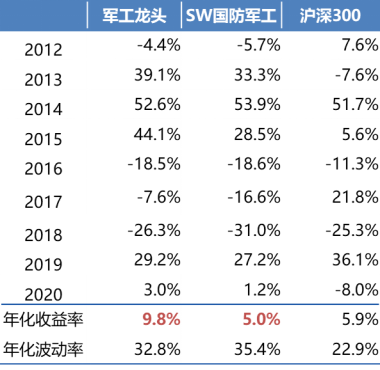 图:军工龙头指数历年表现与申万国防军工指数对比