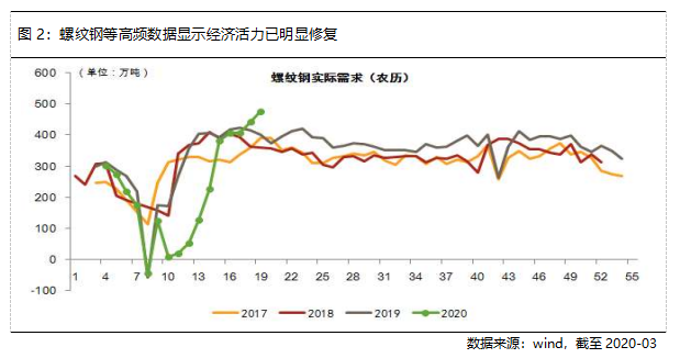 值得注意的是,单从3月数据来看,虽然较1-2月明显改善,但还未完全恢复到正增长,这主要是因为3月初部分地区仍受到疫情的较大影响。从工业耗煤、地铁客运量、螺纹钢需求量等高频数据来看,3月中下旬复工复产已明显加快,预计经济基本面将持续修复。