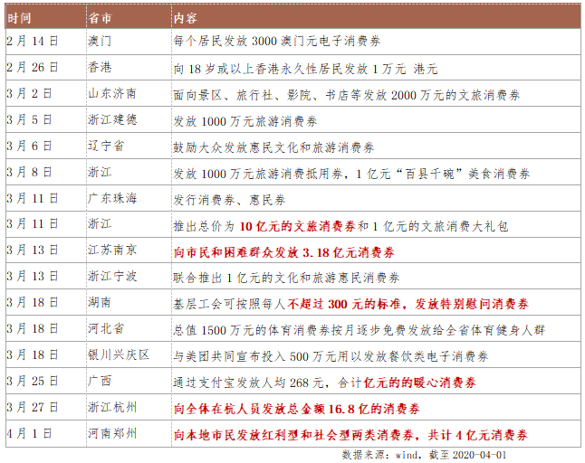 截至3月底,全国上下已有20个省市的39个地区,累计投放消费券总额超42.73亿元,其中餐饮、旅游和零售行业是投放重点。消费券作为短期提振消费有力手段,有望直接拉动商贸零售相关消费,并能催化餐饮旅游复苏,从发放金额最高的杭州来看,已兑付政府补贴4863万元,带动杭州市场消费7.53亿元,拉动效应达到惊人的15倍。同时释放汽车、家电等耐用消费品需求,也将成为疫情冲击下提振消费经的重要引擎。3月31日国常会确立扩大汽车消费重要举措,同时已有多地“取消限购”“以旧换新”政策相继出台。按照中央财政以奖代补,支持京津冀等重点地区淘汰国三及以下排放标准柴油货车,以及北京政府针对排放老旧车型补贴来看,假设在本次补助下国Ⅲ车均能换购,以北京存量23.3万辆计算,换购车15万元/辆,约能拉动汽车消费350亿,若推广至全国,约有828万辆报废换购空间,预计新一轮耐用品消费突破在即。