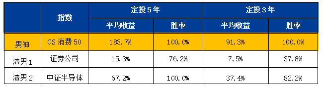 从2013年7月开始,每个月月初都开启定投3年OR 5年的定投计划,然后PK“男神”消费的收益和“渣男”半导体、证券的业绩: