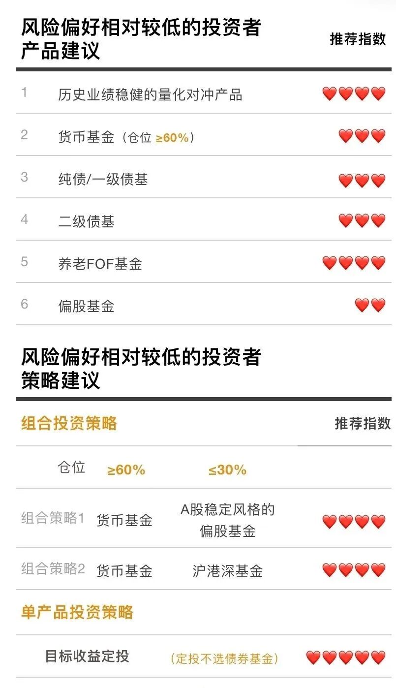 总而言之,风险偏好相对较低的客官在做投资策略时,一定要先确保投资风险符合自己的预期,再去追求一个好的收益,切勿盲目跟随不适合自己的投资方式哦! 而组合投资保证60%以上的货币基金持仓或者目标收益定投,都是将市场风险摊低的不错选择!