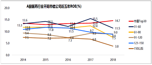 牛志冬:龙头公司由于盈利的稳定性,获得的估值优势越来越显著。对比A股不同市值梯队平均ROE,可以发现市值Top30的公司ROE自2015年持续改善,其他梯队ROE下滑,这说明行业集聚效应正在加速。