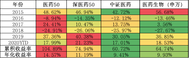 在市场下跌阶段(2016、2018年)医药50仅下跌8.94%、24.91%,相对市场其他医药指数更为抗跌。