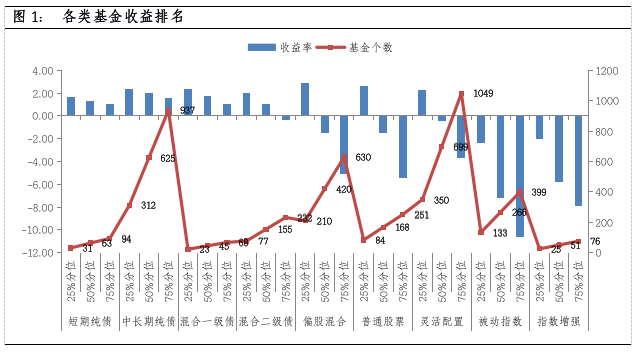 在此期间,主动权益类基金则逆势取得相对不错的成绩。据wind数据,灵活配置型、普通股票型、偏股混合型基金的平均收益分别下跌0.34%、0.50%、0.71%;从25%分位数来看,灵活配置型、普通股票型、偏股混合型基金的收益率则分别为2.24%、2.65%和2.5%。