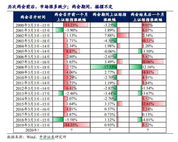 wind数据显示,往年两会前后,市场涨多跌少,在过去20年中,在两会召开前,仅有三次出现市场下跌的情况,其他17个年份均有不同幅度的上涨。