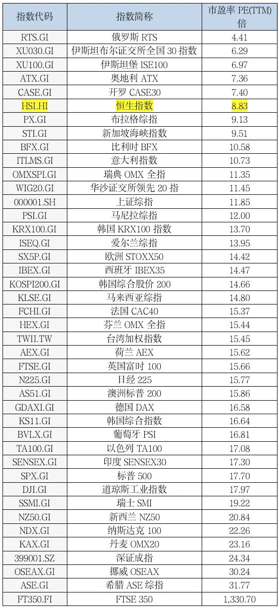 我们发现在最便宜的一片白菜地中,恒生指数赫然在列。堂堂亚洲金融中心,背靠中国经济体,不管从流动性、安全性、市场容量还是投资便捷性等各个角度相比,显然与其他排名相近的国家股市不是一个水平,但已经便宜到这个程度了?