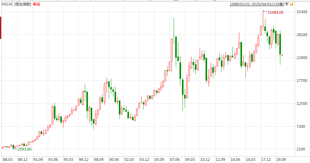 从概率学角度来说,连续扑街不常有,真的遇到了也算是历史随机分配的机会,毕竟风水轮流转。真实的历史告诉我们的确如此,在恒生指数1988年至今的季线里可以看到,港股的每一场大跌之后都孕育着一个崭新的机会——