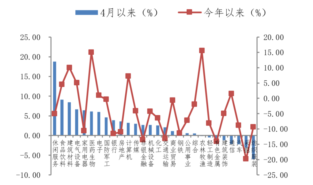 A股而言,4月以来结构化行情突出,特别是前期受影响较大的休闲服务板块近期走势较强。28个申万一级行业中,休闲服务4月份大幅上涨21.71%。另据中国饭店协会调研统计,住宿行业复工复产率大幅提升至89%,绿色饭店达到93%;酒店入住需求方面,携程数据显示,近期预定量显著回暖。体现在A股市场,复工复产加速的逻辑正在兑现。