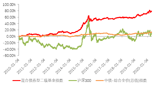 至于客官们最关注的收益性,从长期效果来看,混合债券型二级基金指数竟然也能成为吊打沪深300的存在……