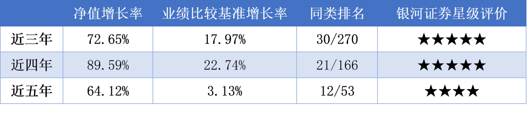 过去3年、4年和5年的业绩排名都跻身同行前列。