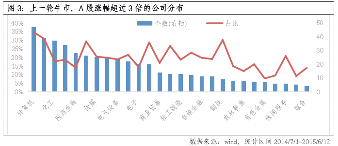 事实上,节奏上可以将上轮牛市区间划分为4个时间段:普涨-大盘占优-中小市值占优-“滞涨”行业“补涨”,而全程来看,中小市值的成长板块占优;牛股分布层面,计算机、房地产、化工、机械设备、医药个数占优,其背后是当期行业景气度的演绎。对于计算机来说,互联网大潮叠加行业政策和热点事件催生上涨的动力,房地产层面,市场的繁荣成为投资端有力的支撑。但从牛股占比来看,相较于长期,上一轮牛市个股普涨的倾向更大一些。