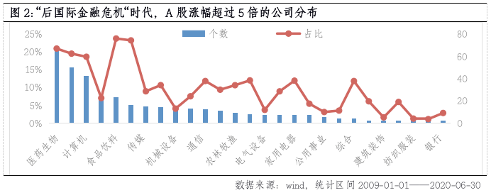 2009年国际金融危机之后,尽管大盘指数表现一般,但A股上涨超过5倍的个股有367只,主要分布在医药生物、电子、计算机、化工、食品饮料等,而行情演绎的背后的则是时代的变迁和龙头公司的进阶。