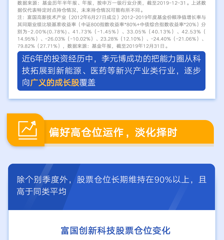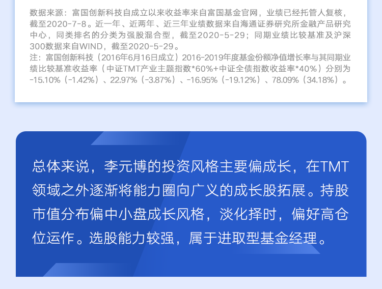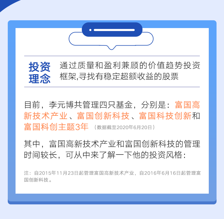 目前李元博管理的基金包括富国创新科技、富国高新技术产业、富国科技创新、富国科创主题3年,管理规模超100亿元,选股能力突出,长期来看超额收益显著。(管理规模数据来源:基金季报,截至2020年3月31日)