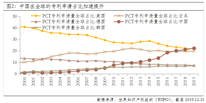 而且在科技创新方面,中国“已能扛鼎时代”。2008年以来,中国在全球的专利申请数量和占比加速提升,目前已超越美国成为全球第一大专利申请的经济体,占比也从3.75%上升至22.26%。另外,根据WIPO发布的2019年全球创新指数报告,中国的全球创新指数排名为第十四位,已连续四年保持上升态势,并成为中等收入经济体中唯一进入前30的国家。