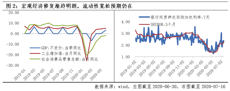 进一步看,当前A股的核心动力,主要在于流动性宽松逐渐让位于宏观经济的修复。对于短期市场下跌,需要更多考虑的是,下跌前后A股市场环境发生了哪些变化。从经济基本面来说,2季度GDP增速由1季度的-6.8%回升至3.2%;6月工业增加值同比增速继续改善到4.8%,社会消费品总额自上月-2.8%改善至-1.8%;经济数据持续释放积极信号,基本面复苏趋势明朗,但节奏与强度需进一步观察。而对于流动性来说,近期短端利率较为稳定,同时,从央行近期操作来看,本周共展开1300亿元7天期逆回购操作,并投放4000亿元MLF,累计净投放5300亿元,货币政策环境并未变差,目前仍是积极偏稳健的基调。未来,当短期情绪稳定之后,市场有望走出修复行情。