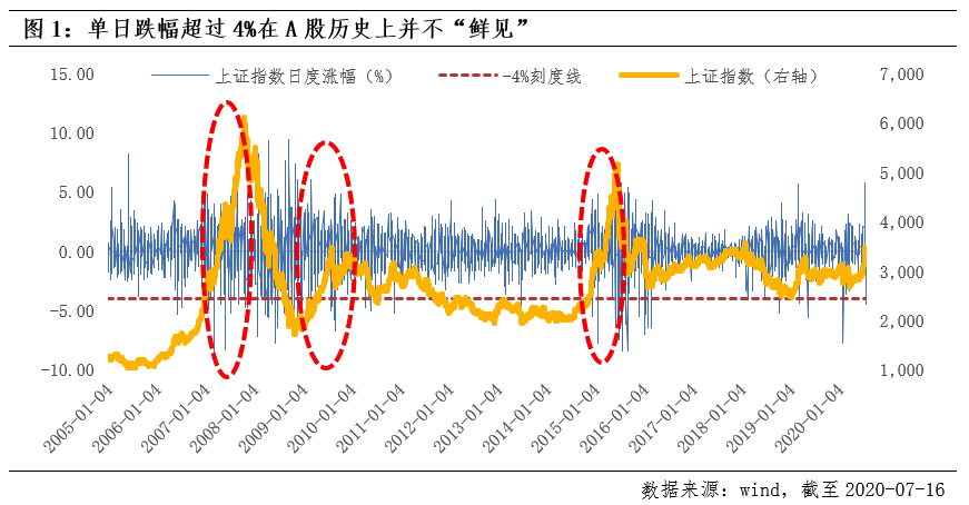 历史上,上证指数单日跌幅超过4%,往往是市场情绪的集中反应或者是“黑天鹅”事件的表征,很多情况下,难以改变市场的趋势。复盘2005年以来的A股历史,单日跌幅超过4%的现象并不鲜见,2005/1/1-2020/7/16期间,共出现76次;其中,在2006-2007、2008-2009、2014-2015三轮牛市中也出现了18次。因此,即使是牛市,较大幅度的调整也较为正常。考虑到本次A股单日大幅下跌的原因,基本可以归结为“前期上涨节奏过快+外围不确定性有所加大+股票解禁担忧+部分板块的负面冲击”的共振。