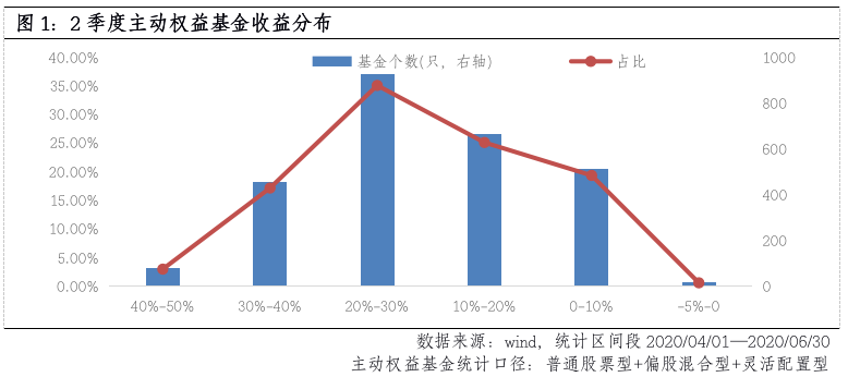 剔除2020年1季度后期成立的基金,在全市场2642只主动权益基金中,处于前25%分位的基金最低收益达到28.32%,平均收益达到34.24%;中位数收益为21.40%,即使是排在最后25%分位的基金,收益也能达到12.89%。同期上证指数、沪深300上涨8.52%、12.96%,仅446只基金跑输上证指数,占比仅为16.88%。结构上,医药与科技基金表现亮眼,2季度市场收益排名前50的主动权益基金中,20只为医药基金,几乎占据半壁江山。而在科技类基金中,富国的富国科创主题3年、富国互联科技、富国科技创新、富国创新科技表现较为优异。