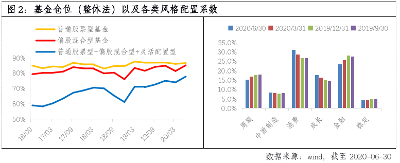 持仓结构上,2季度主动权益基金仓位相对于1季度有所提升,按照整体法计算,普通股票型和偏股混合型基金仓位分别达到87.3%、82.1%,分位数均处于历史相对较高的位置。风格上,2季度,主动权益基金主要加仓消费、成长以及中游制造,减仓金融、周期和稳定,加仓与减仓的板块配置系数的剪刀差处在历史较高的位置。具体到行业层面,休闲服务、电子、食品饮料、医药加仓幅度较大,而银行、纺织服装、建筑装饰以及采掘减仓幅度较大。