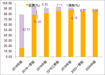 2019年、2020年至今,身处市场中的我们都尝到了股票市场的甜度,享受了结构性牛市的快乐。再看这只基金的仓位变化,2019年一季报就显示,基金经理将大部分仓位由债券转移到股票市场,由16.37%的股票仓位快速提升至77.17%(此数值为占基金总资产的比例),可以说是既享受到了2018年的债牛,又带持有人领略了2019年的快速上涨。