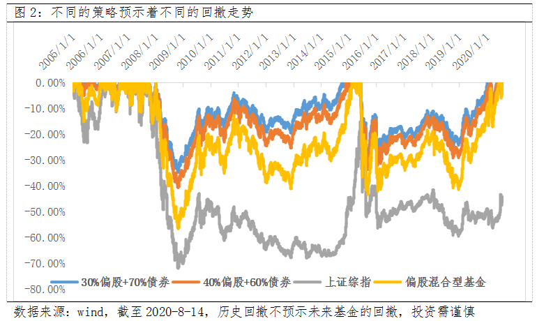 查理˙芒格曾经在1973年和1974年的市场动荡中每年回撤超过30%,最大回撤超过50%,即使如芒格般优秀的投资人都再也不想经历高回撤的痛苦体验,一般投资人就更难面对了。从不同策略的回撤走势看,“股-债-现金”配置在总体层面对回撤控制进行把握,在2008的熊市大调整中30%偏股混合型基金指数+70%债券指数、40%偏股混合型基金指数+60%债券指数、偏股混合型基金指数、上证综指的回撤分别为34.34%、、40.24%、56.18%、71.31%;2015及2016年的熊市大调整中回撤则分别为28.06%、31.99%、42.04%、52.87%。