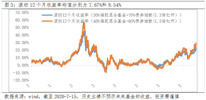 市场上流传着“基金赚钱基民不赚钱”,拉长投资期限是降低波动的好方法。自2012年以来30%偏股混合型基金指数+70%债券指数、40%偏股混合型基金指数+60%债券指数滚动12个月的平均收益可达到7.67%和8.54%,其中收益率大于0的概率分别为91%和88%。