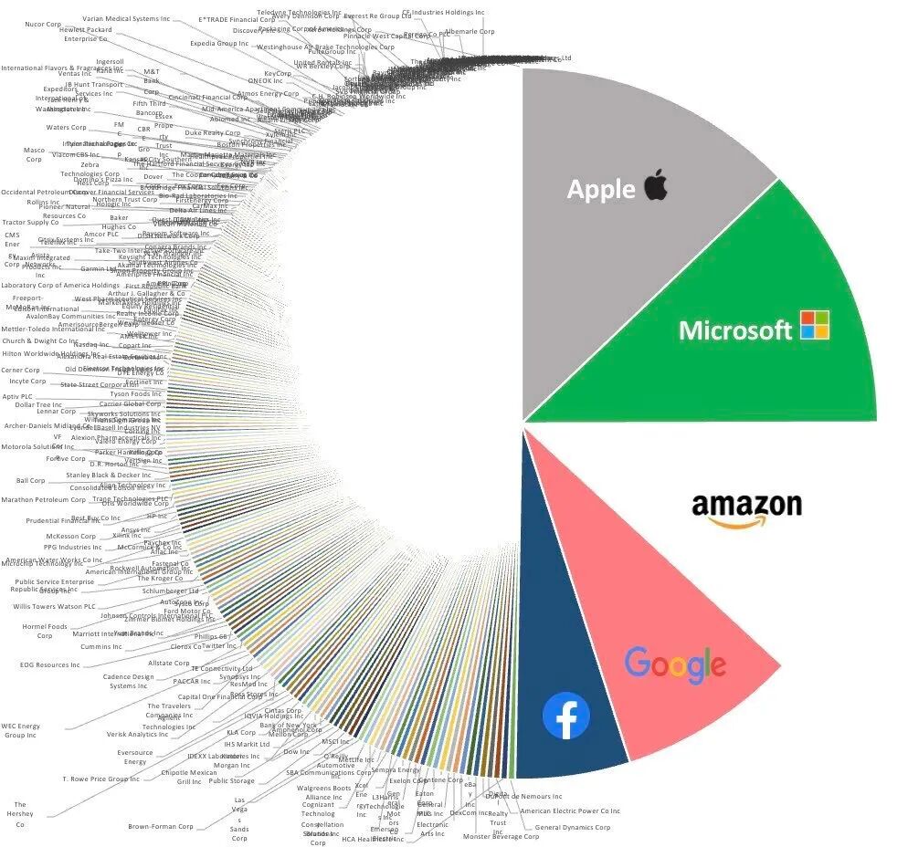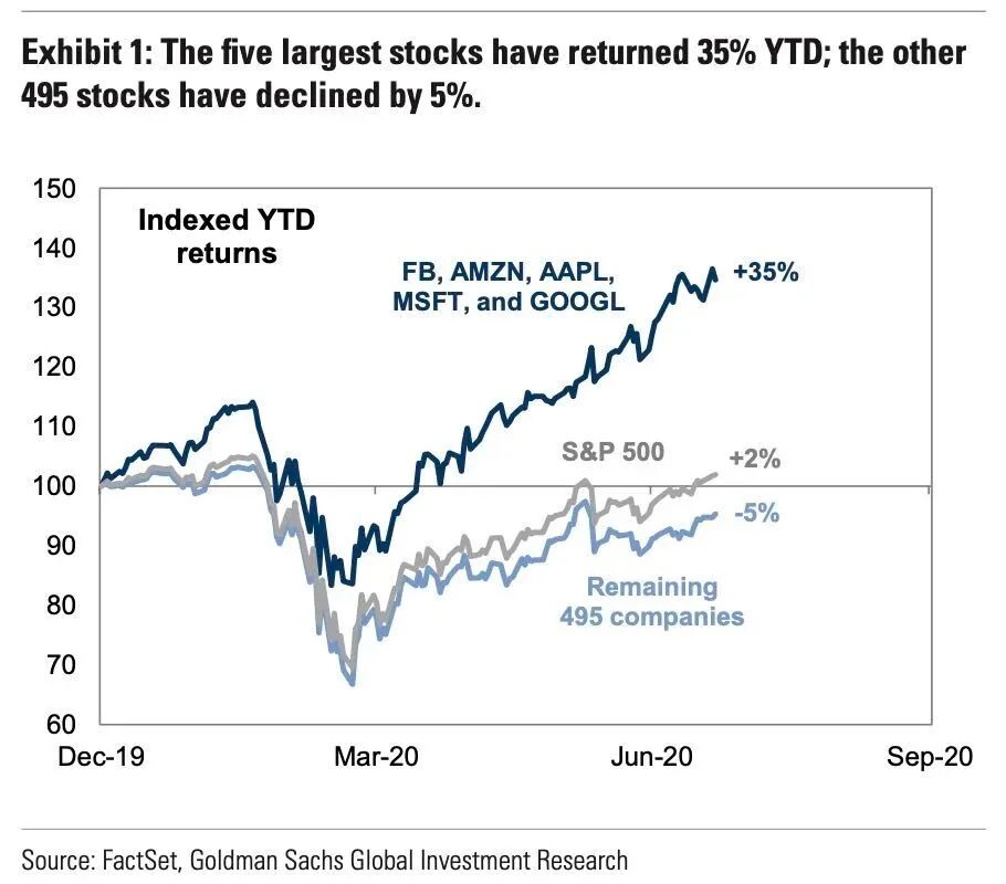 我们不妨来看一下海外的科技股公司是什么走势。截止2020年6月30日,美股中faamg5家公司的总市值已经相当于最低的360家公司的总和。自今年以来,即便有重大公共安全卫生事件影响,这5家公司股价仍然上涨了35%,而其他495公司下跌了5%,所以美国的股指主要由这些具有垄断地位的科技类公司带起来的。