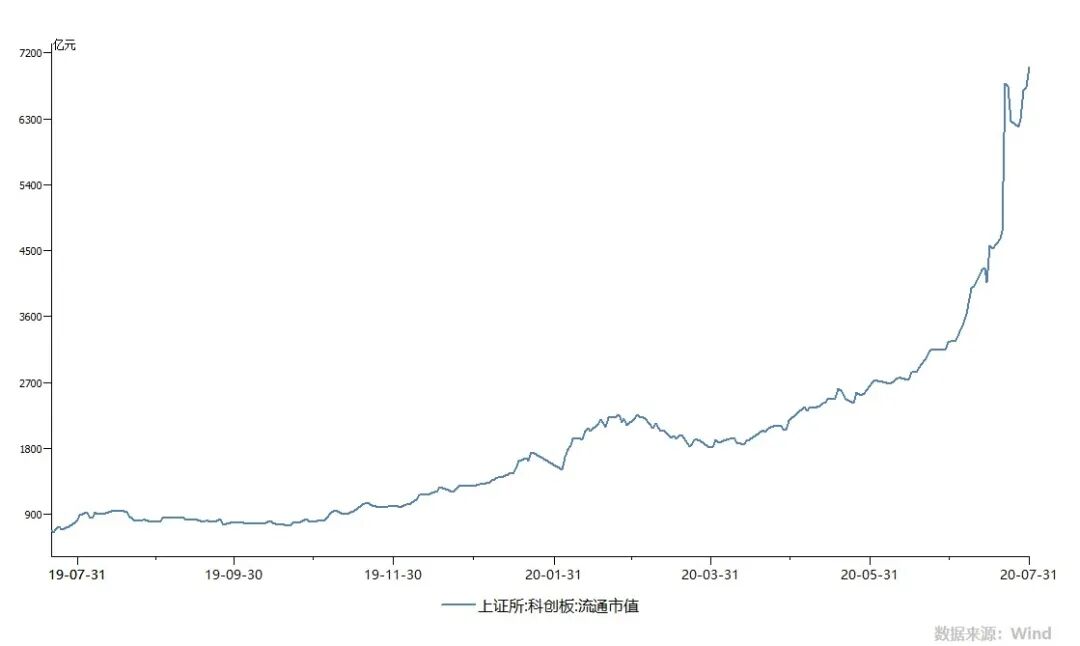 来看一下上证所发布的数据。科创板的流通总市值正在迅速提高,从年初的约2000亿快速抬升到目前的7000亿。其中一方面有整体上涨的因素,另一方面也有新上市企业的因素。