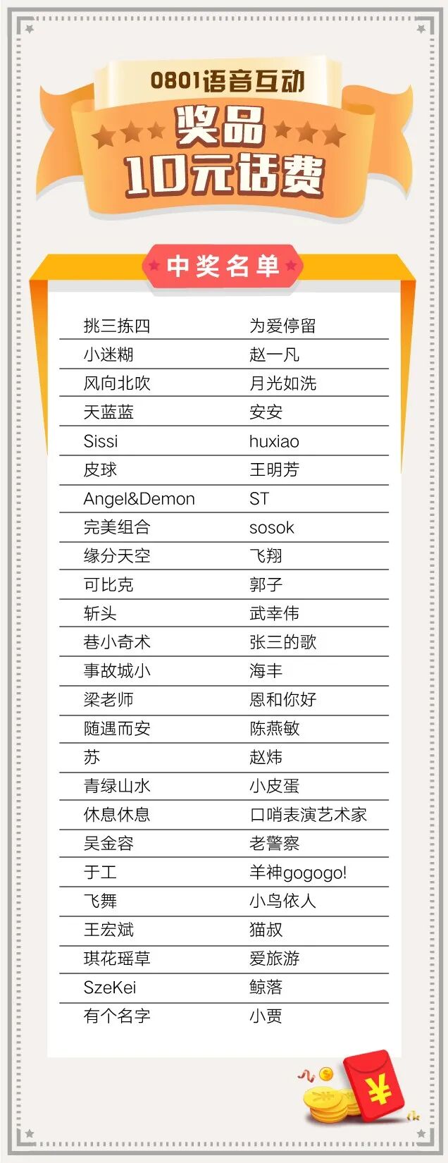 话费将于8月7日(本周五之前)充值到中奖客官后台预留的手机号码中,请各位客官耐心等待~