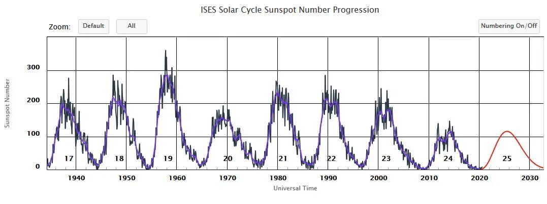 第25个太阳周期已确认起始于2019年12月,此后太阳活动将开始慢慢加剧,预计在2025年7月达到高峰。