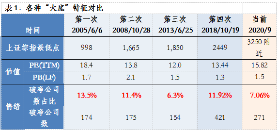 第一次(2005/6/6)在“股权分置改革”等政策利好下步入大牛行情;第二次(2008/10/28)在“四万亿投资”和“十万亿信贷”政策刺激下,经济触底回升,股市迎来V型反转。第三次(2013/6/25)随着国企改革提升风险偏好,央行降准降息释放流动性,迎来“政策牛”和“宽松牛”。第四次(2018/10/19)经历信用扩张等措施之后,也是从熊市中苏醒了过来……