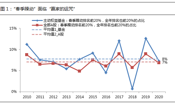 事实上,统计2010年以来的市场表现可以发现,“春季躁动”中涨幅最大的个股和基金,正好是全年涨幅最大的品种,这种概率是很低的。换言之,“春季躁动”面临“赢者的诅咒”。对投资者而言,在“春季躁动”里赚了钱,切不可就此放松警惕,而应密切关注一季报和两会政策,借此寻找真正的全年主线。