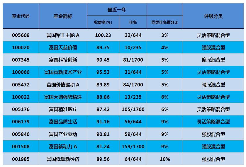 每一个标准体系里,都会有一批好学生,富国基金主动权益类产品过去一年业绩优秀的好产品可不少,平均的收益率都超过了66%,所以就不在这里一一列举,主要列出几位杰出代表即“近1年收益率超80%”、同类排名居前10%的“好学生”: