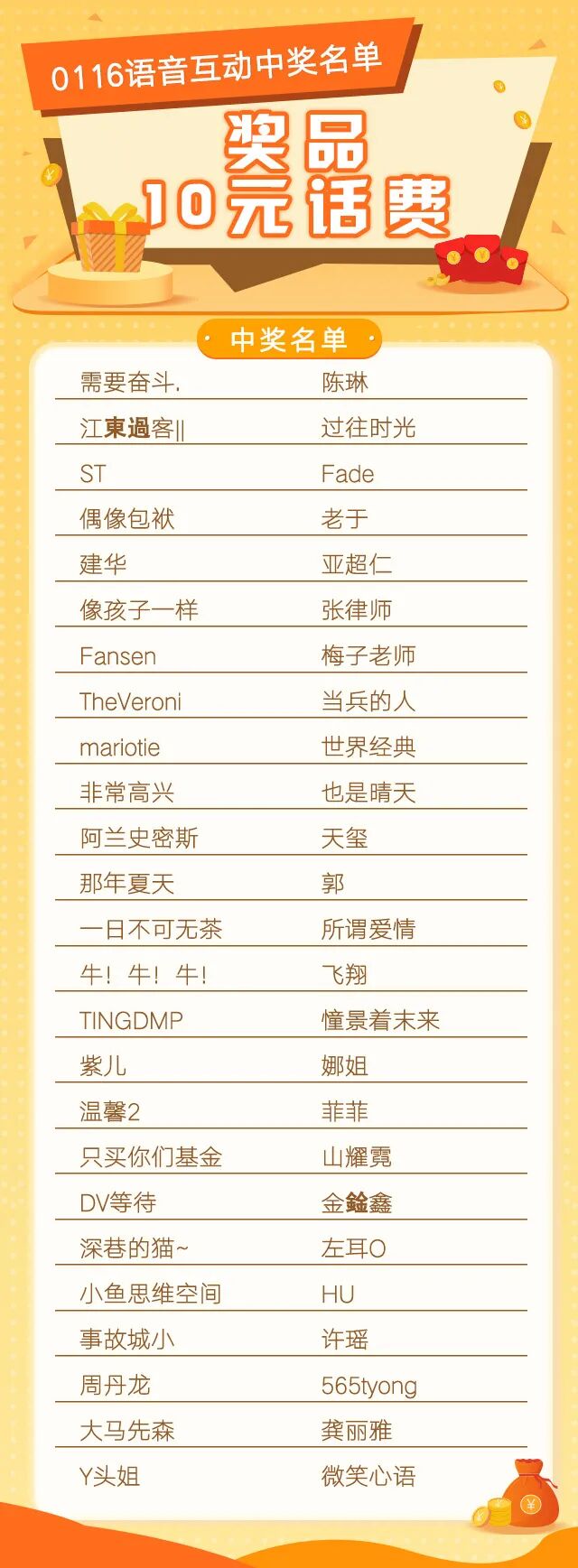 话费将于1月21日(本周四之前)充值到中奖客官后台预留的手机号码中,请各位客官耐心等待~