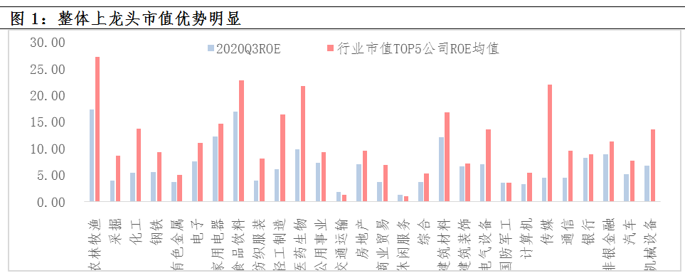 。龙头公司的ROE相较于行业平均水平具有明显的优势。据wind数据,2020年3季度,28个申万一级行业中,市值处于TOP5的公司,平均ROE水平高出行业平均数值达到4.4%,最高值达到17.63%,当然也存在龙头公司的ROE低于行业平均的较少数情况。