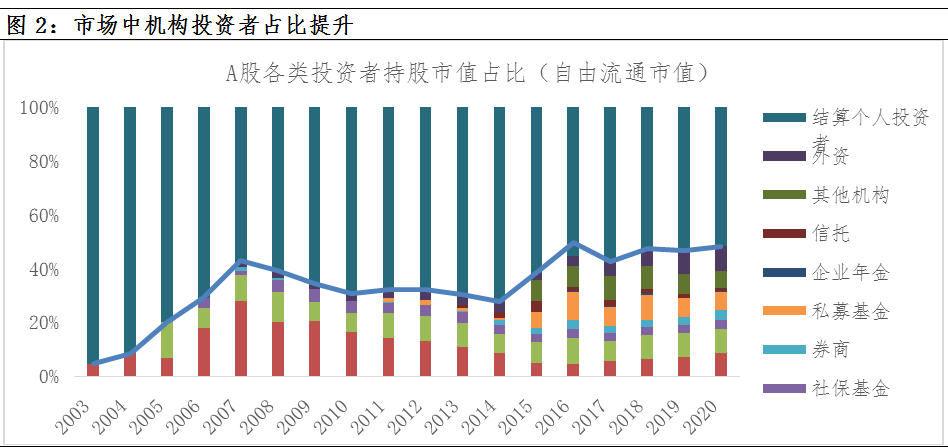 据中金公司测算,按自由流通市值口径计算,个人投资者持股的比例已经从2014年的72%下降到2020年的52%,机构投资者则从2014年的38%上升到2020年的48%。