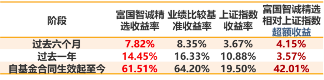 注:富国智诚精选(2019年9月6日成立)2020年及2021年上半年基金份额净值增长率与其同期业绩比较基准(中证工银财富股票混合基金指数收益率×90%+银行人民币活期存款利率(税后)×10%)收益率分别为50.71%(48.70%),7.33%(8.67%);过去六个月、过去一年、自基金合同生效以来富国智诚精选及其同期业绩比较基准收益率数据来自定期报告,同期上证指数涨跌幅数据来自wind,时间截至2021-09-30。