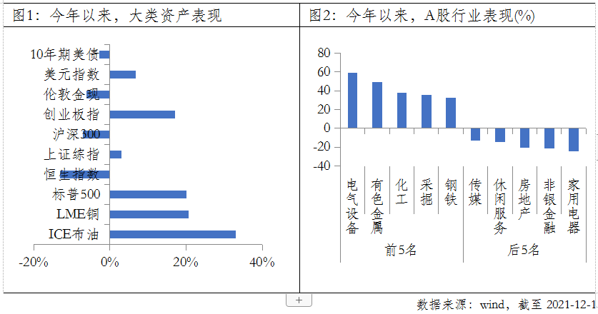 今年以来,在“低基数效应+政策刺激”下,全球需求端共振修复,但供给端受新冠疫情反复和“双碳””共识推进的影响,全球劳动力短缺、供应链紧张、能源紧缺,供需的失衡致使全球通胀持续走高。从大类资产的表现看,能源、原材料等大宗商品表现占优,“商品为王”的特征显现;从A股行业表现看,涨跌幅TOP5的行业分别为电气设备、有色、化工、采掘和钢铁,其中,周期行业占据了4席。