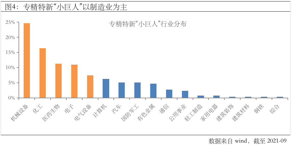 其中,在“专精特新”的助力下,中小型高端制造企业或迎黄金发展机遇。今年年初以来,培育和支持专精特新企业的表述及政策出台变得更为密集,先后出现在“十四五”规划及“730政治局会议”中,并上升至国家发展战略高度,由此可见,培育专精特新“小巨人”势在必行。而且专精特新大都瞄准“缝隙市场”,在细分领域建立了竞争优势,甚至具有垄断话语权,能有效连接产业链的“断点”、疏通“堵点”。根据统计,A股的专精特新公司有256家,从行业看,以机械设备、化工、医药、电子、电气设备为主,合计占比71%,主要集中在新一代信息技术、高端装备制造、新能源、新材料、生物医药等中高端产业领域。