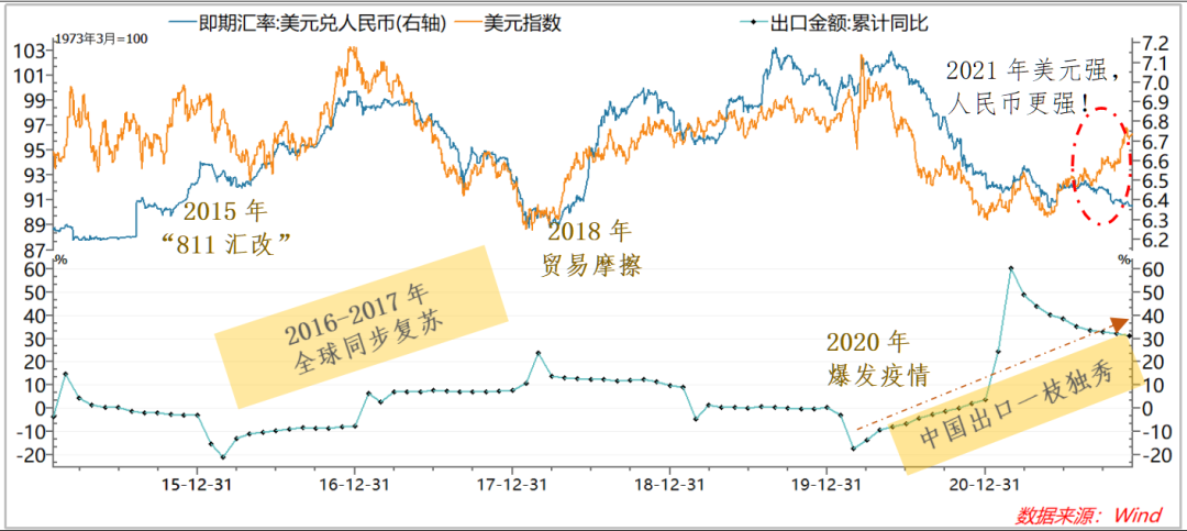 2020年疫情爆发后中国供应链的稳定性在全球出口份额的抢夺中起到了决胜的作用,贸易顺差不断上升带动银行结售汇差走阔,且境内美元存款突破1万亿美元。历史上,每一轮人民币的涨跌都与出口或出口预期的变化相关,从2017年全球经济复苏到贸易摩擦、谈判波折、疫情,再到过去两年中国出口一枝独秀,总结成一句话,出口强,则人民币指数强。