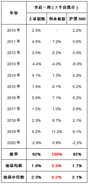 级掌柜统计了2010年以来,春节后一周,上证指数、创业板指和沪深300的收益情况:
