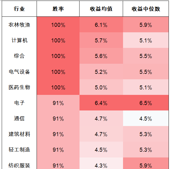 其次,农业、计算机、电气设备、医药等行业,2010年以来的胜率高达100%,即2010年每年春节后的一周,这几个行业100%取得正收益;
