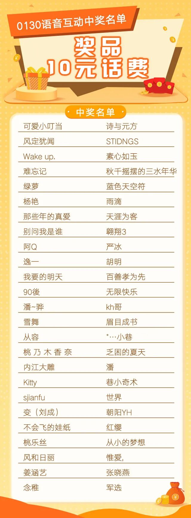 话费将于2月4日(本周四之前)充值到中奖客官后台预留的手机号码中,请各位客官耐心等待~